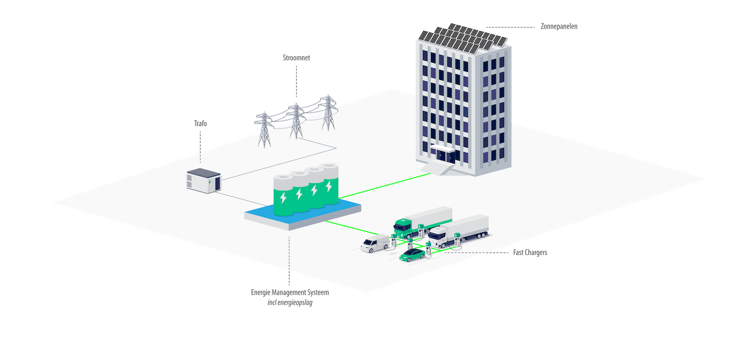 Ontdek het slimme kantoorgebouw van de toekomst, waar duurzaamheid en efficiëntie perfect samenkomen. Dankzij zonne-energie, batterijen voor energieopslag en slimme laadstations, allemaal aangestuurd door een geavanceerd Energy Management System (EMS), zonder uitbreiding van je netcapaciteit. Dit geïntegreerde systeem maakt je gebouw niet alleen efficiënter en goedkoper, maar zorgt er ook voor dat je bijdraagt aan een groenere wereld. Zo creëer je een moderne en milieubewuste werkplek waar iedereen graag wil zijn.